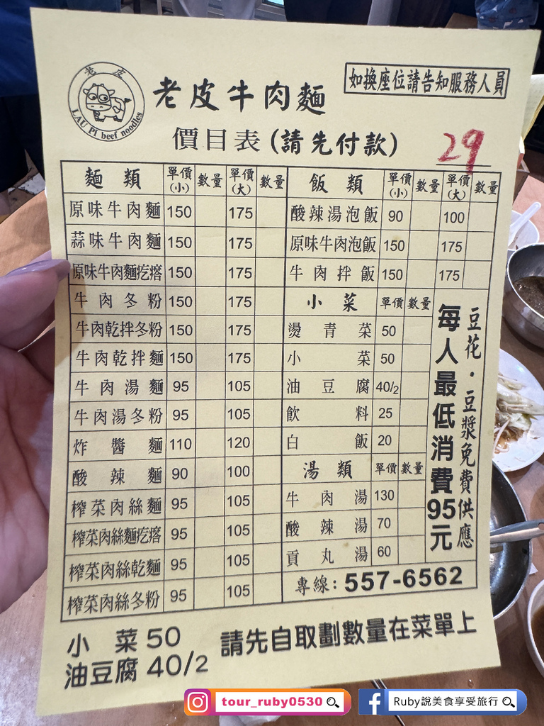 在新竹湖口的老皮牛肉麵是一家相當受歡迎的小吃店,內用的低消為每人95元,
