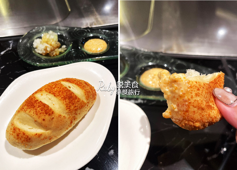 現烤的麵包表皮酥脆,裡面熱熱的搭配店家的魚卵沙拉醬起司鹹味,
