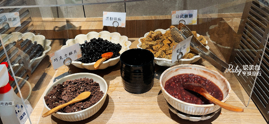 配料有巧克力酥片、黑糖珍珠、蜜紅豆和日式蕨餅,