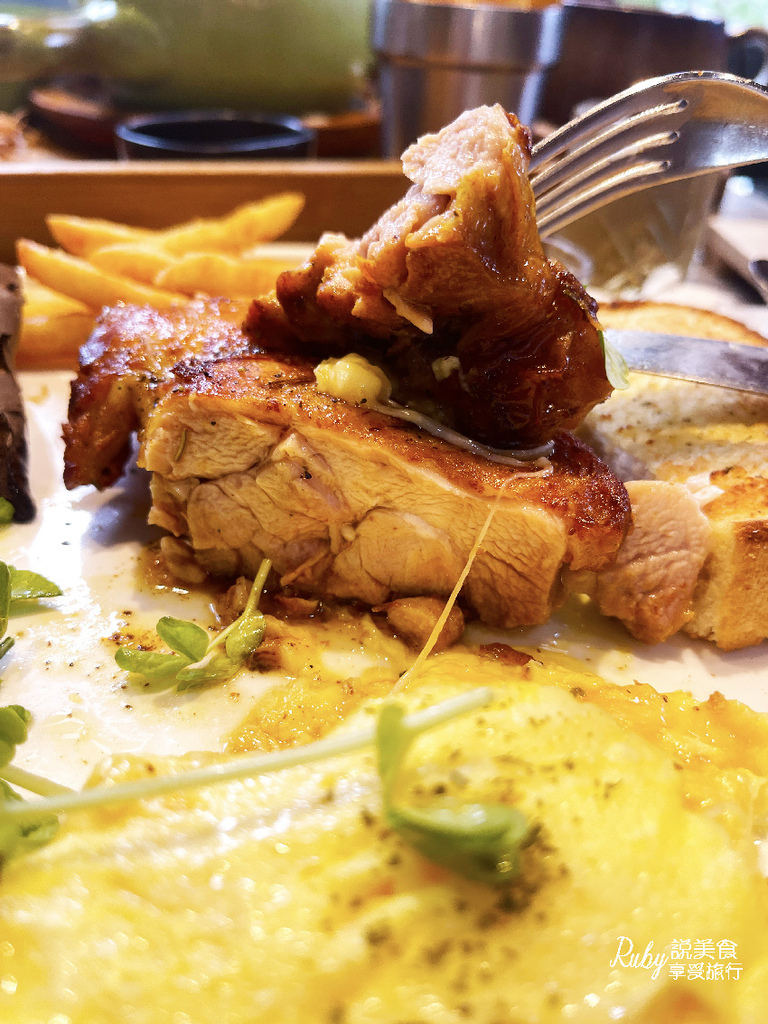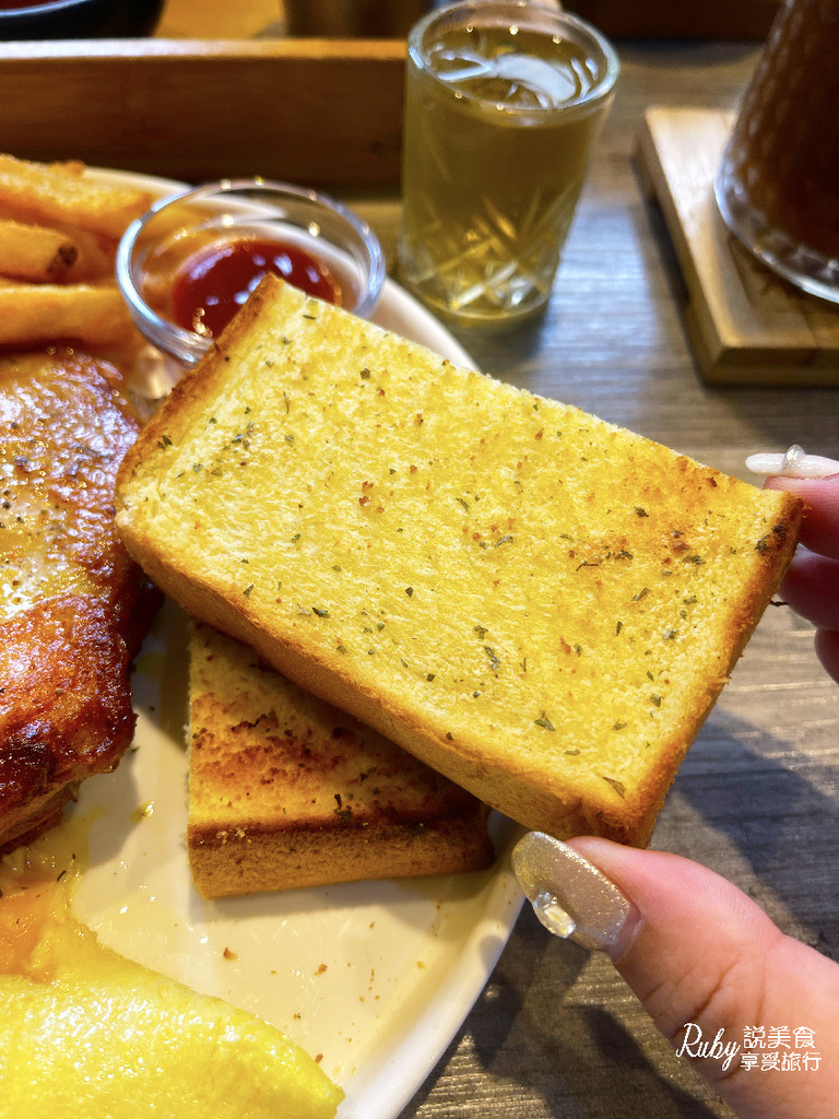 和兩片香蒜吐司-現烤的吐司真的會吃到想在續點以及滿厚實的的現煎雞腿排-一切下去很多汁不會乾澀標準的鮮嫩多汁,