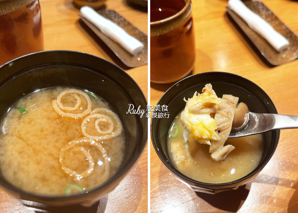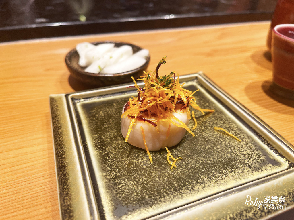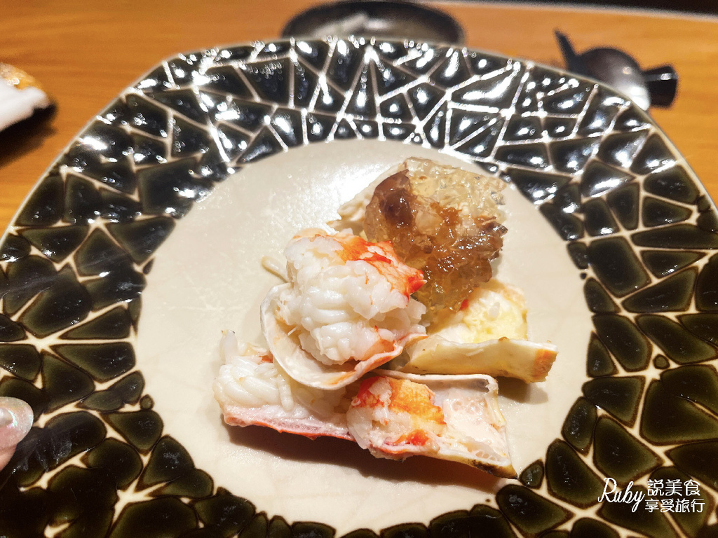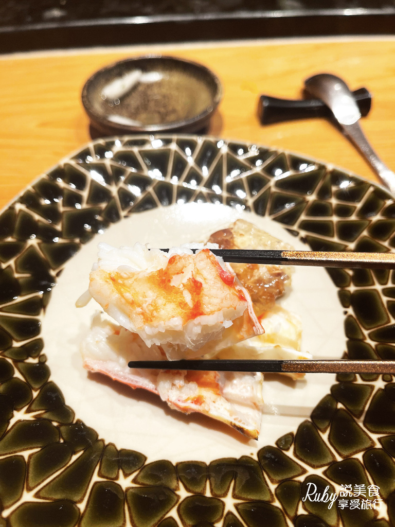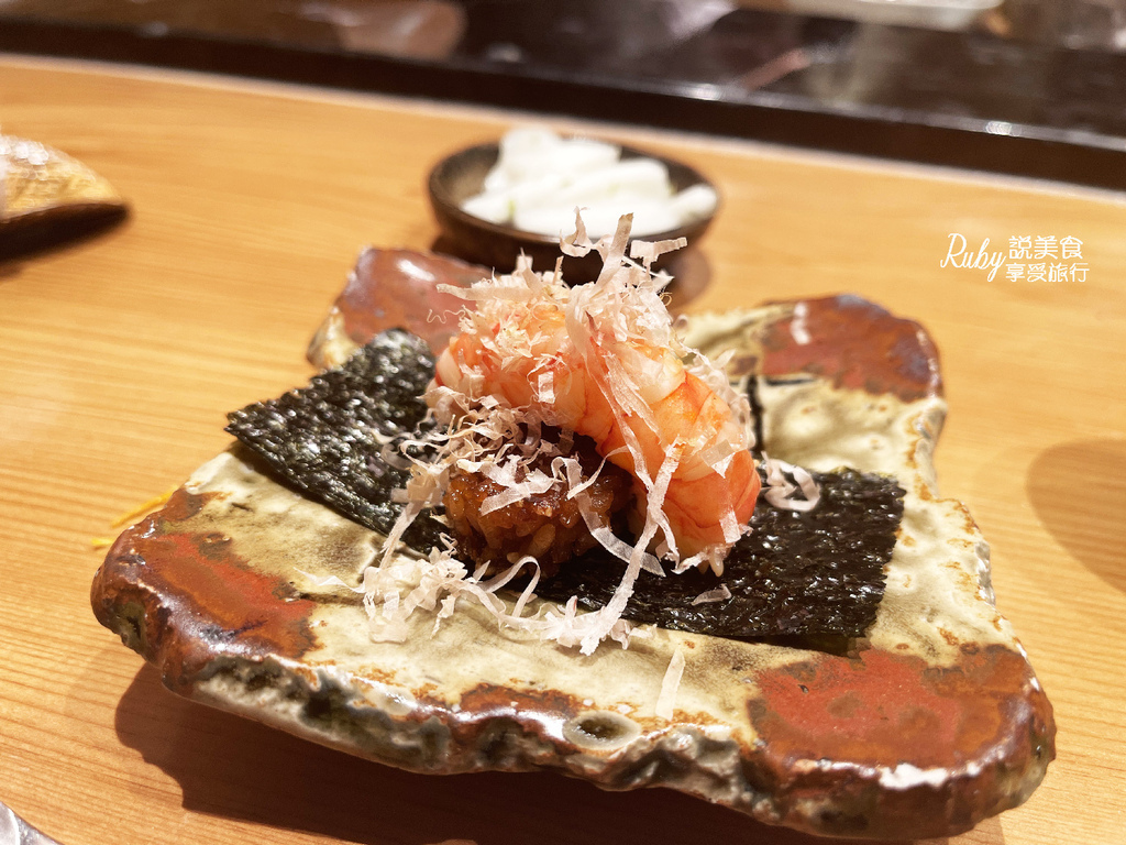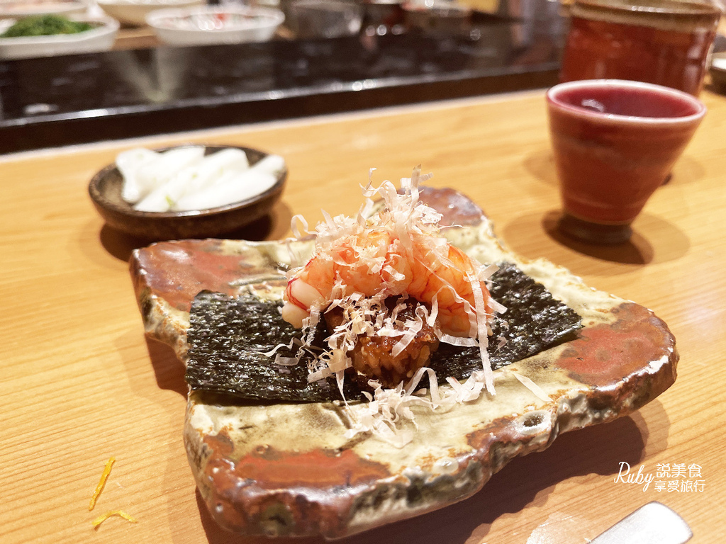 胭脂蝦用海苔包起來,下面的飯有一點像鍋巴的口感,上面是鮪魚絲RUBY以為是柴魚片,算是一道創意料理。