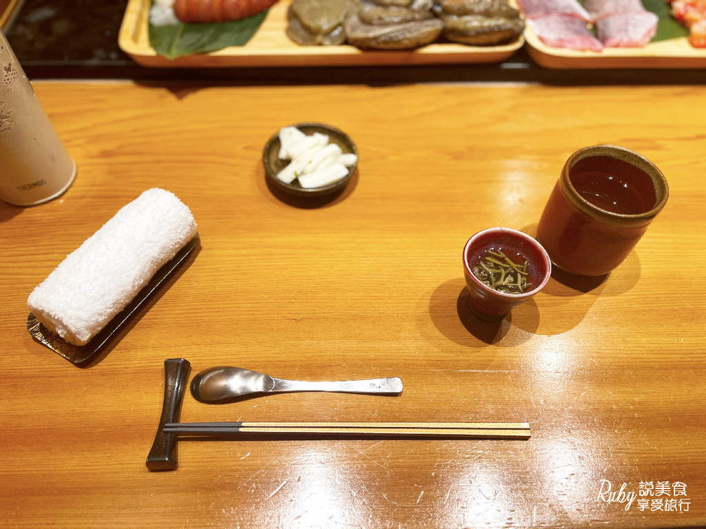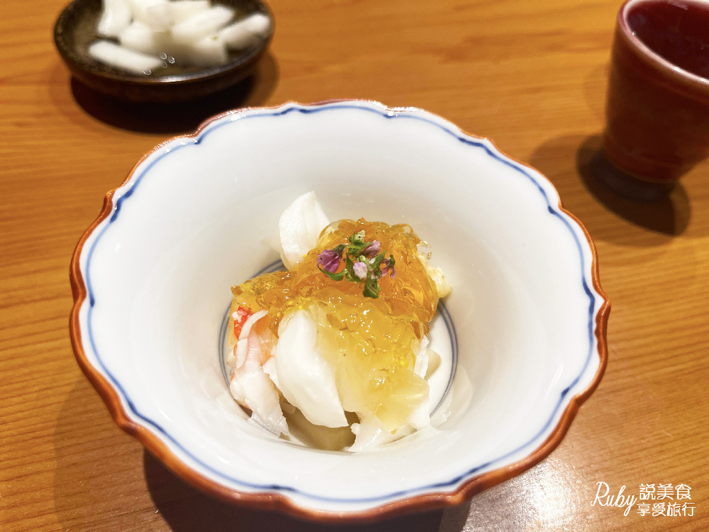 桌上會有乾淨的濕毛巾可擦手,還有開胃菜是沖繩海島的醋,有一點勾芡的味道RUBY滿害怕這口感的。
