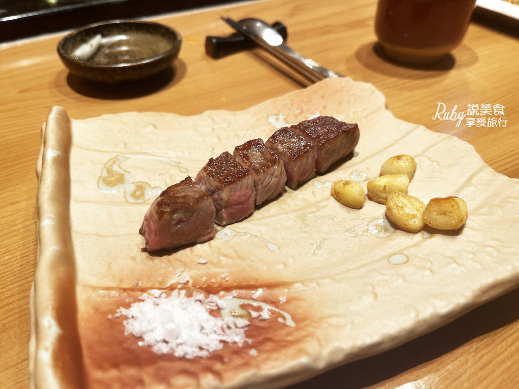 日本和牛用櫻桃木燻牛肉,簡單的調味旁邊用蒜頭做搭配,旁邊會有馬爾頓海鹽可以沾,