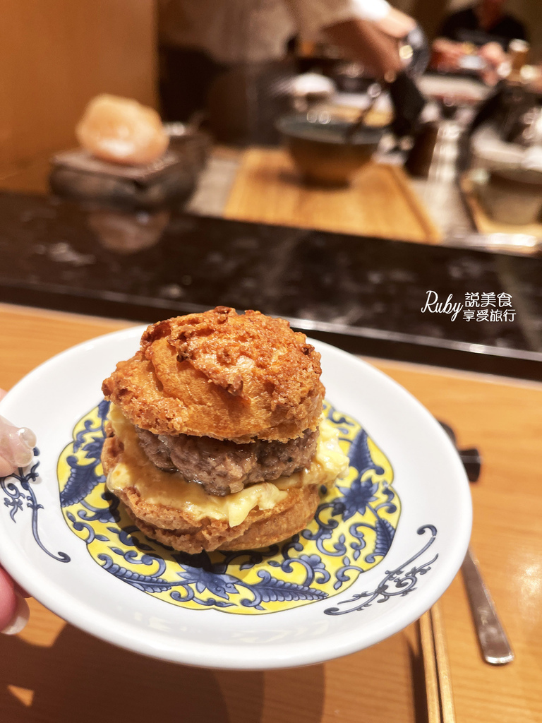 泡芙的脆度和甜度非常的完美比例口感,搭配歐姆蛋的口感把和牛排包在裡面