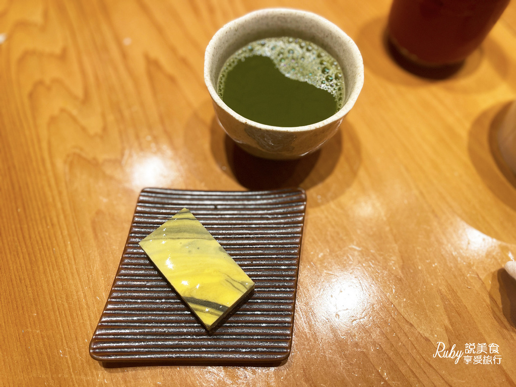 甜點是日本靜岡的熱抹茶,配抹茶起司蛋糕。起司蛋糕的甜度喝上一杯微苦的抹茶剛剛好。
