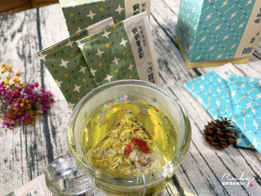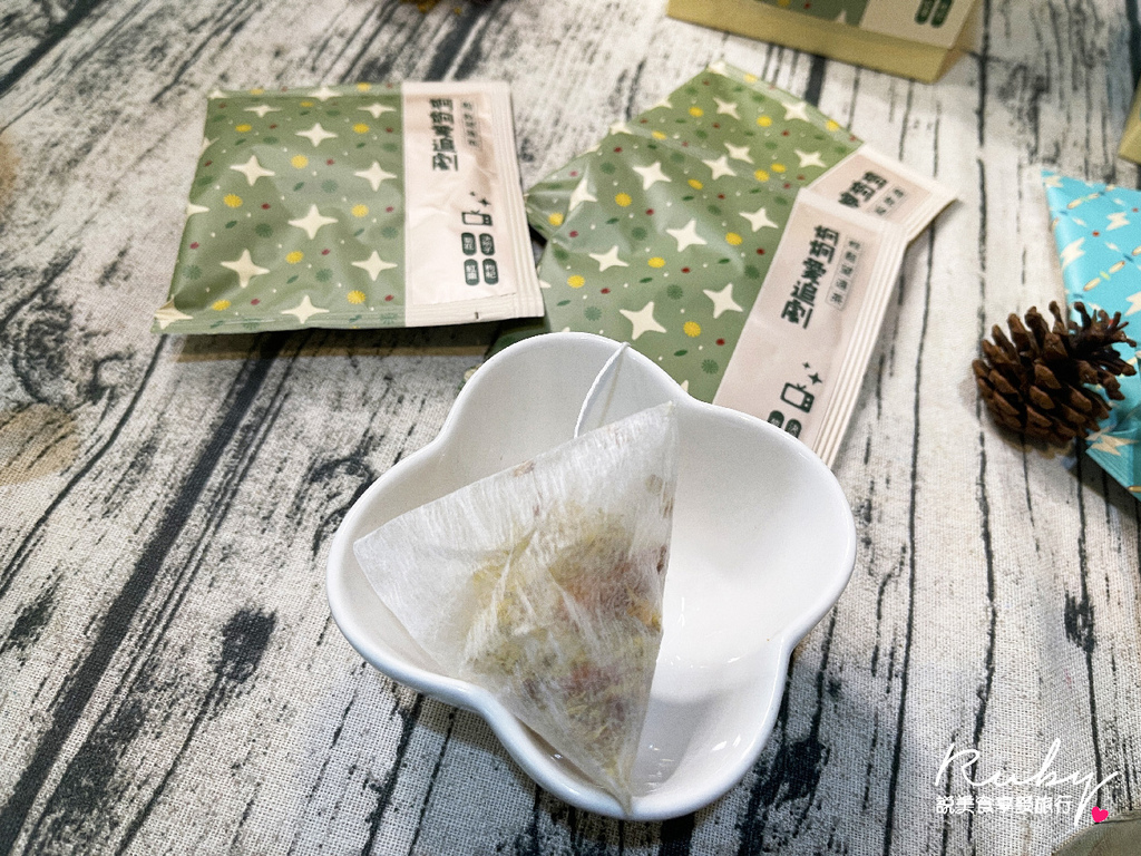 Ruby之前會單泡枸杞來喝,但只有單一味道其實滿單調的,有上網查護眼睛的有三大有菊花、決明子和枸杞,剛好這茶包都有比例也都配好了,