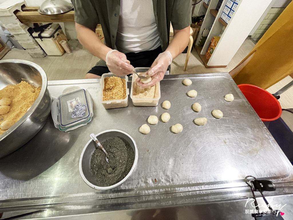 現包的麻糬白白的再丟下去花生粉裡面,好療癒可愛喔~
