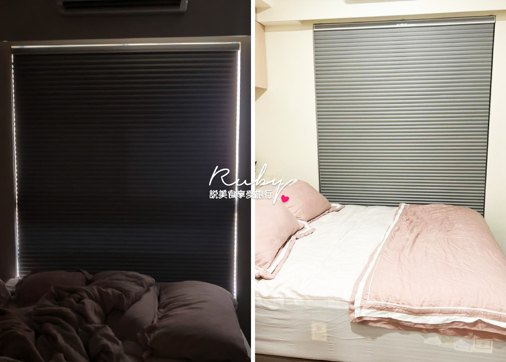 傳統的窗簾大片的、調光簾、百葉窗、羅馬簾和Ruby這次安裝的風琴簾,我跟老闆說我一定要遮光的窗簾。