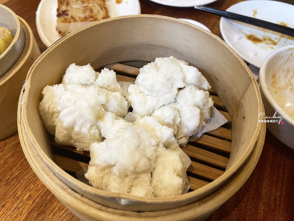 現蒸的叉燒包熱呼呼的,内餡的叉燒甜甜的,與包子皮吃起來很Q彈。