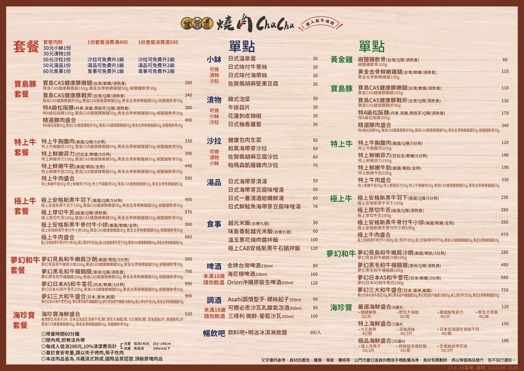 菜單的部分有套餐和單點可以選擇,最便宜280元就可以吃到燒肉了,
