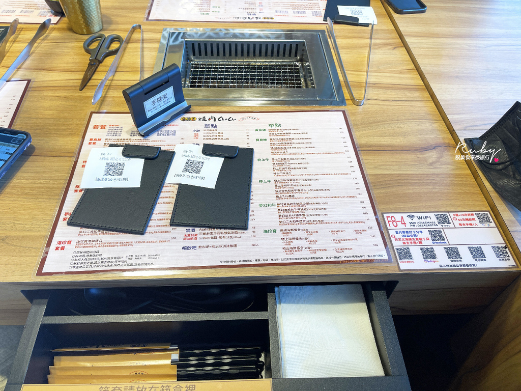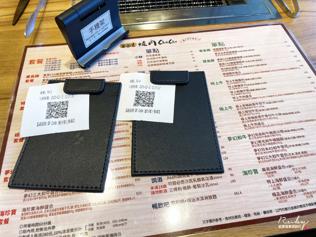 桌上都有紙本的菜單,而燒肉ChaCha點餐是用QRCODE,每一個人各一張,