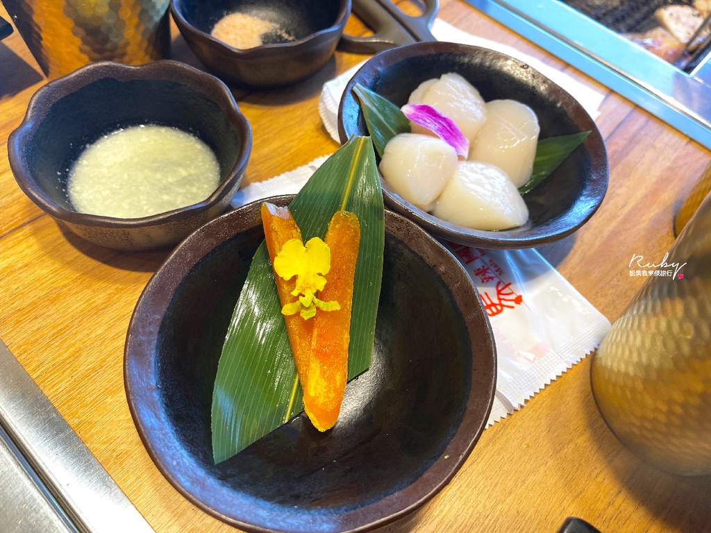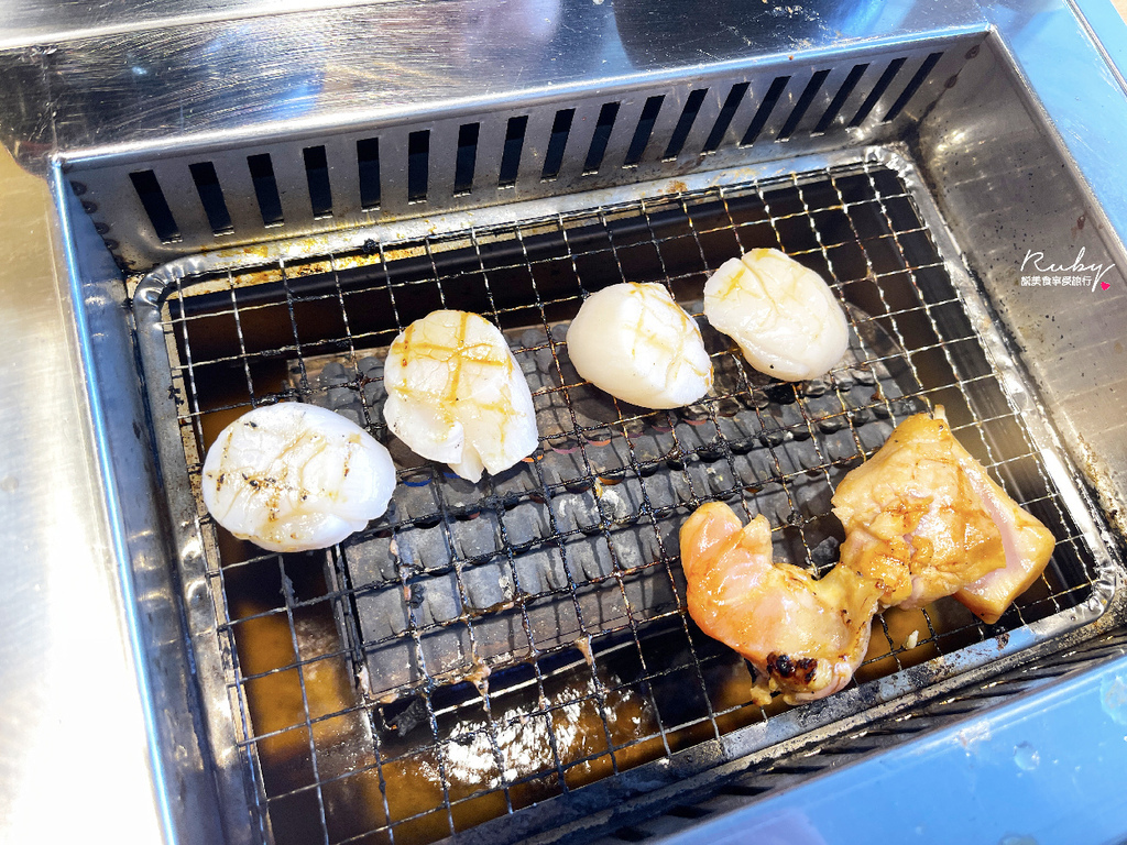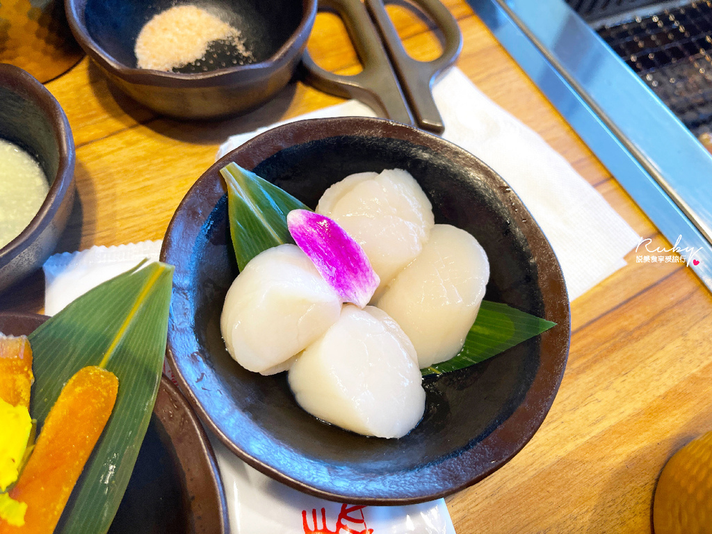 北海道生食級干貝烤到表面微焦裡面帶一點水分是最好吃的,