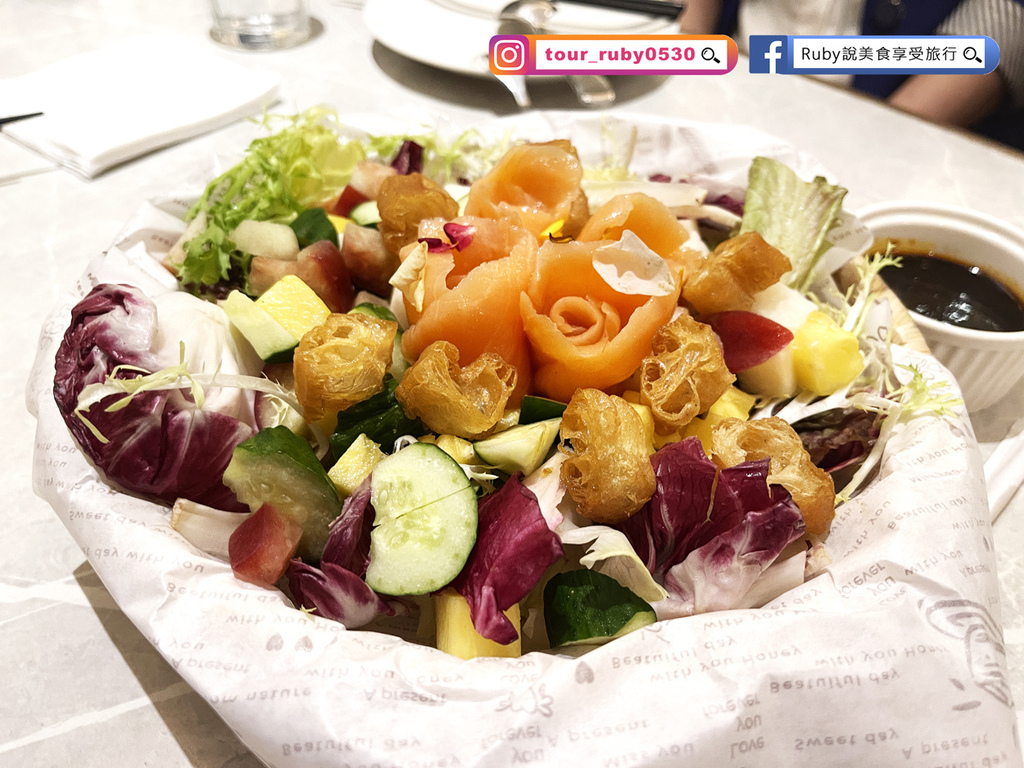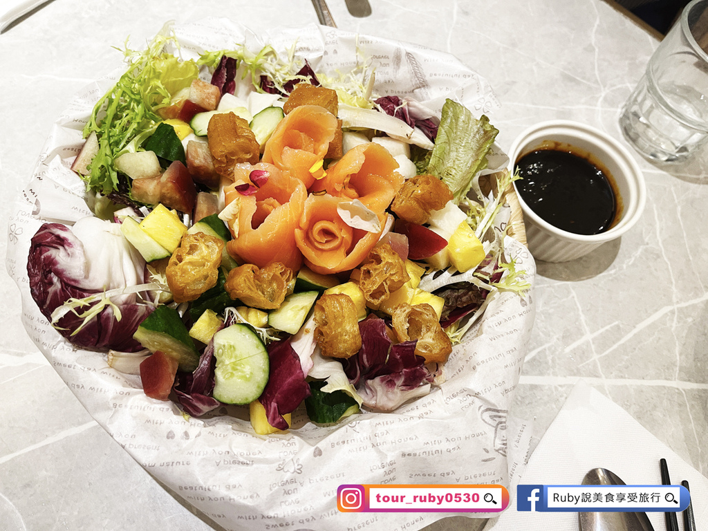 南洋花園羅惹沙拉 ,母親節限定的沙拉,有四片煙燻鮭魚、油條、